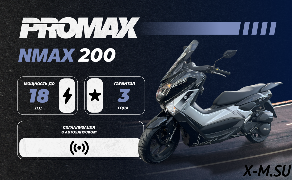 Купил себе PROMAX NMAX 200, отличный аппарат! Мощный движок, хорошо едет, управляемость классная. Диски литые, смотрится стильно. Заводится с полпинка, как электростартер, так и кикстартер работают без проблем. Подогрев ручек - зимой очень выручает. Качество сборки на высоте, ничего не люфтит и не скрипит. Запчасти если что, доступны, это плюс. В общем, полный восторг! Советую всем!