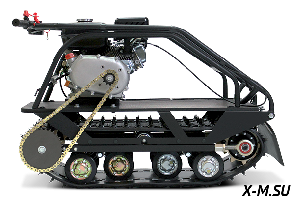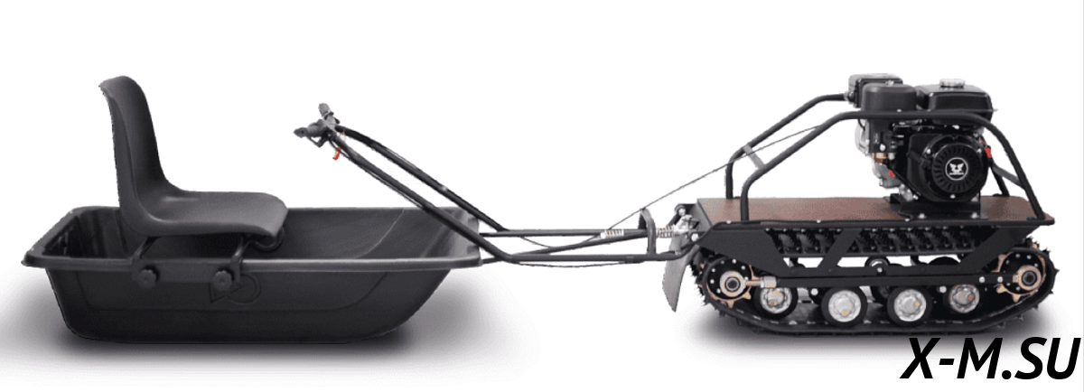 На транспорте установлен монолитный руль, обеспечивающий более прочное и надежное соединение с механизмами мотобуксировщика (например, с барашками и шплинтами). Это способствует жесткости и надежности оборудования, особенно важно это в условиях повышенной нагрузки. Крепление руля находится на уровне гусеницы, что устраняет вероятность опрокидывания буксировщика на бок.
