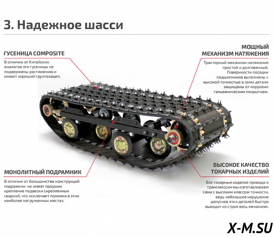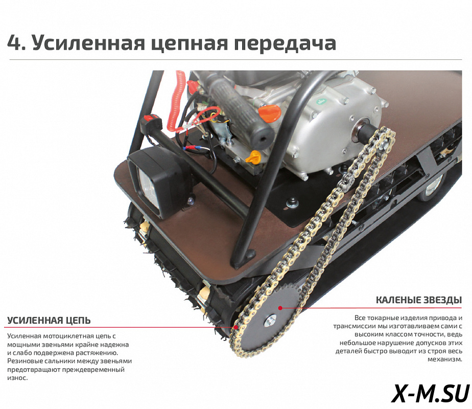 Мотособака оснащена специальной гусеницей Composit, которая обеспечивает отличное сцепление со снегом и со льдом благодаря своим техническим качествам, а также тракторным механизмом натяжения цепи.