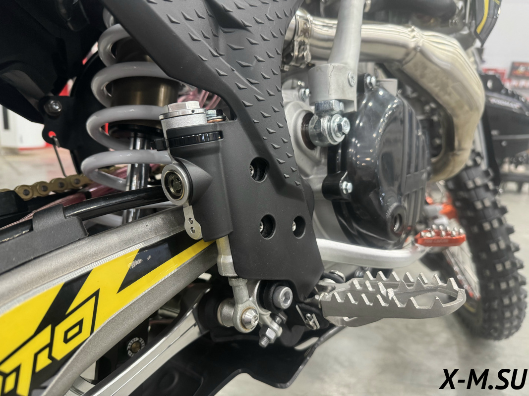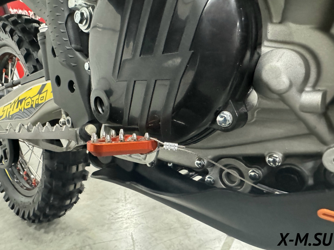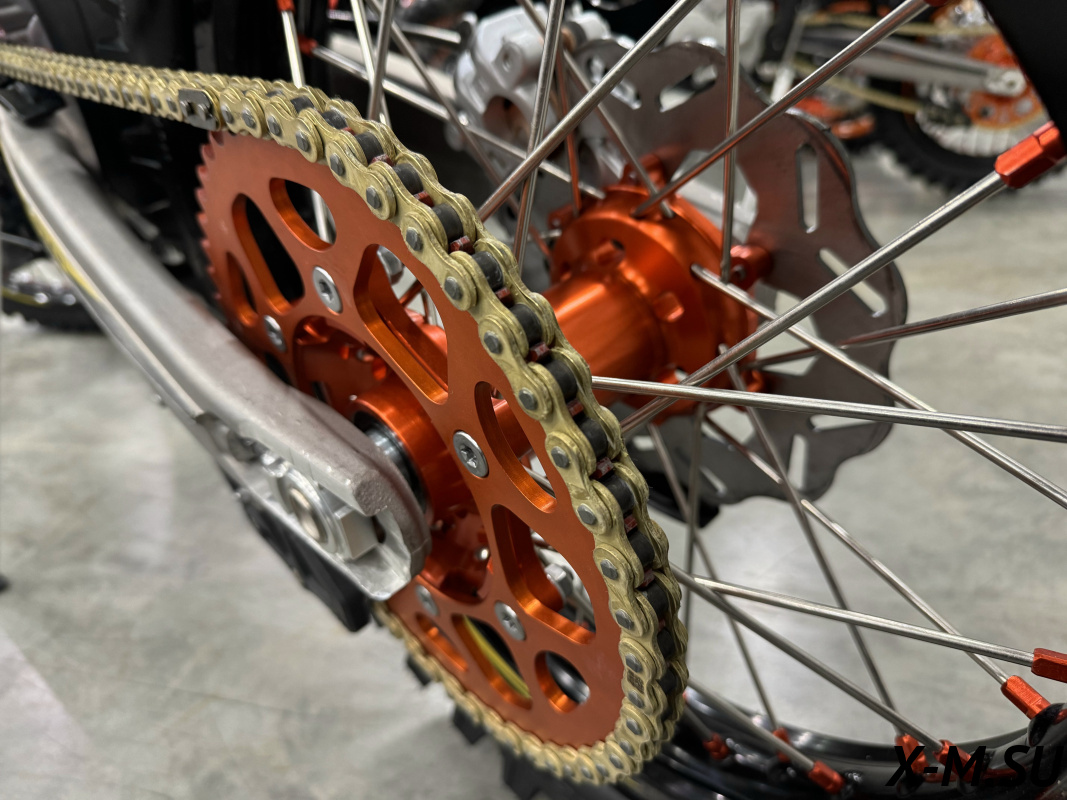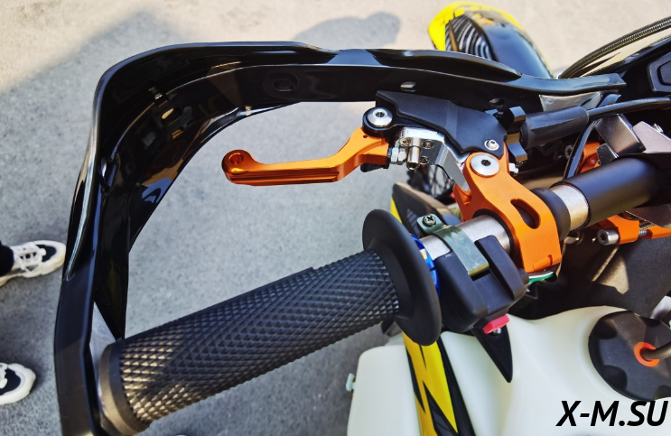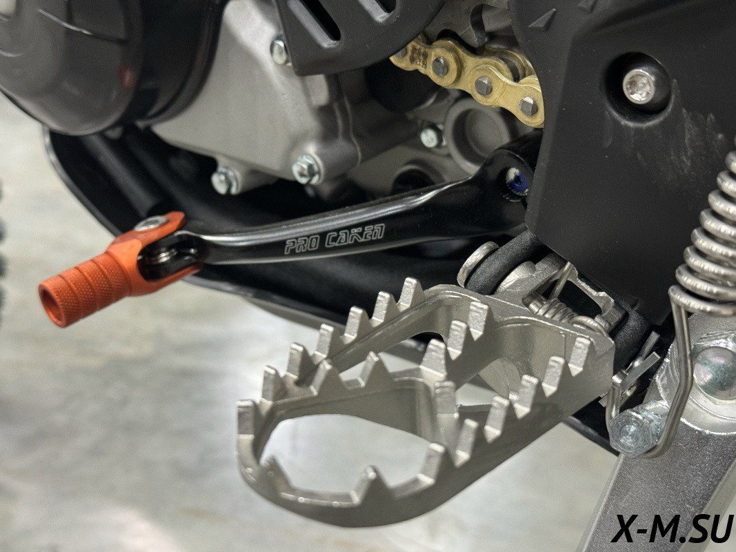 Пластик используется KTM2020 – очень прочный и распространенный, что делает его максимально возможным к обслуживанию. Руль IGP TwinWall 22/28 алюминиевый на всех моделях! Силиконовые грипсы Nibbi Racing – левая на замке, правая на короткоходной ручке газа Nibbi. Рычаги тормоза/сцепления – неломайки, из фрезерованного алюминия от CNC. Влагозащищенные кнопки старт/стоп на руле. Складной рычаг переключения передач, фрезерованный, из алюминия, от бренда PRO CAKEN. Лапка тормоза так же фрезерованная, алюминиевая. Самая легкая и прочная приводная цепь RK520MXZ уже установлена!