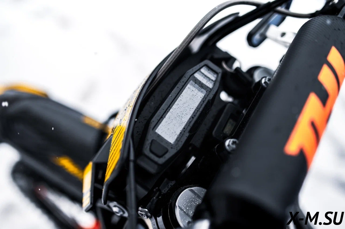Головная фара с пятью светодиодными линзами светит очень ярко и позволяет продолжить покатушки, либо просто вернуться домой в темное время суток. Приборная панель ЖК отображает всю текущую информацию о состоянии мотоцикла. Вся электроника имеет влагозащищенные разъемы, которые абсолютно исключают попадание воды и образование коррозии! Питает электронику аккумулятор, Li-ion, общим весом 200 грамм!!!