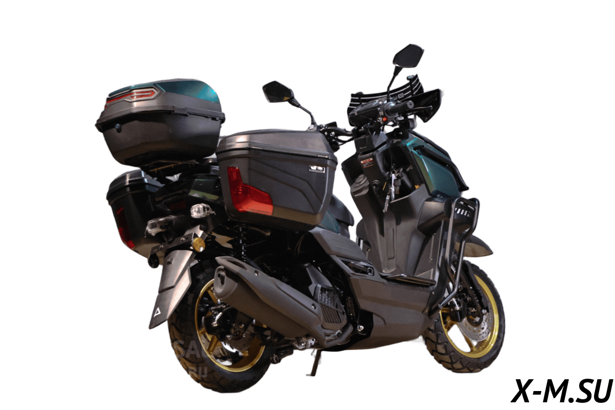 Ветровое стекло, Спидометр, Зеркала, Литые диски, Центральная подножка, Панель приборов, Передний багажник, USB-порт, Багажник под сиденьем, Кофр, Фара, Поворотники, Защитные дуги