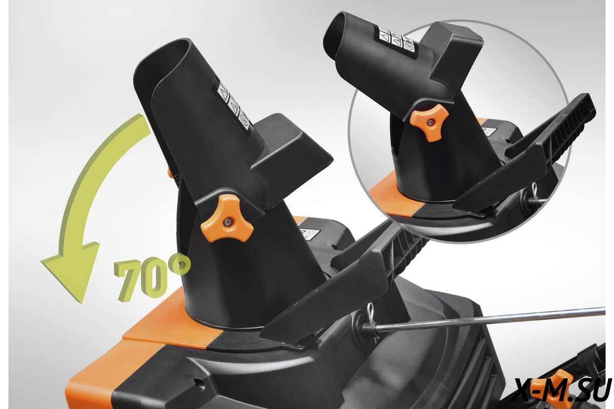 - Желоб для выброса снега. Изготовлен из металла и находится в удобном месте и позволяет перенаправлять выброс снега до 180 градусов с помощью рычага.