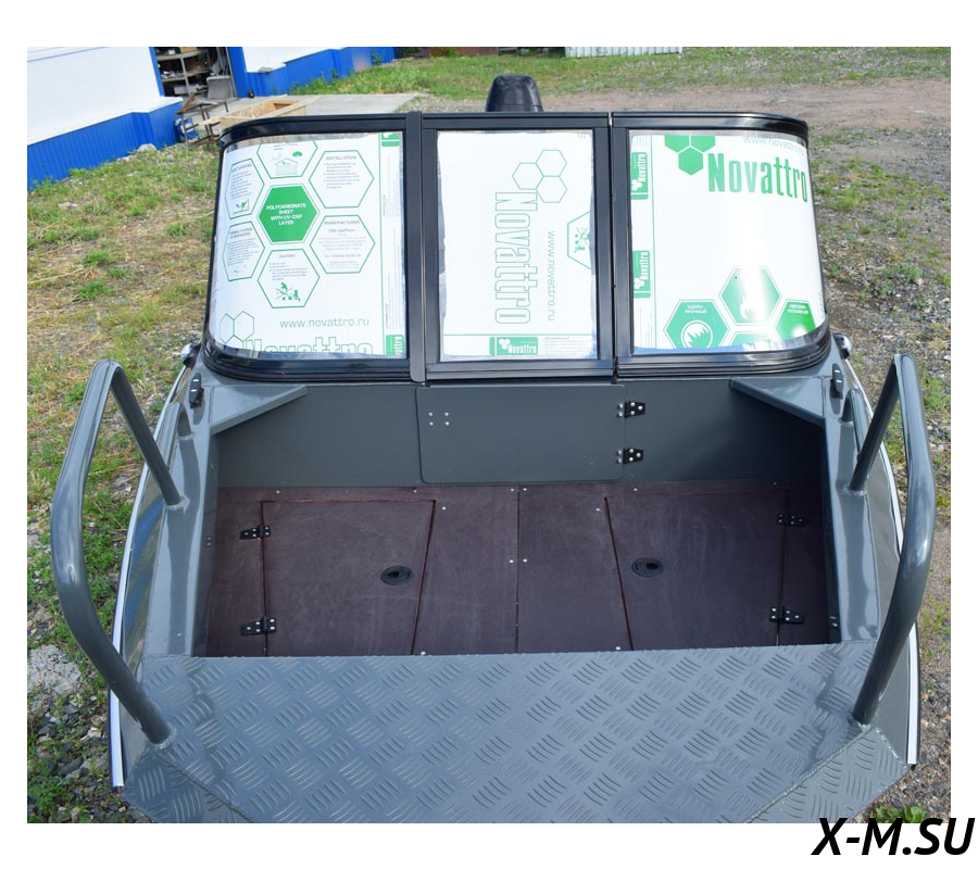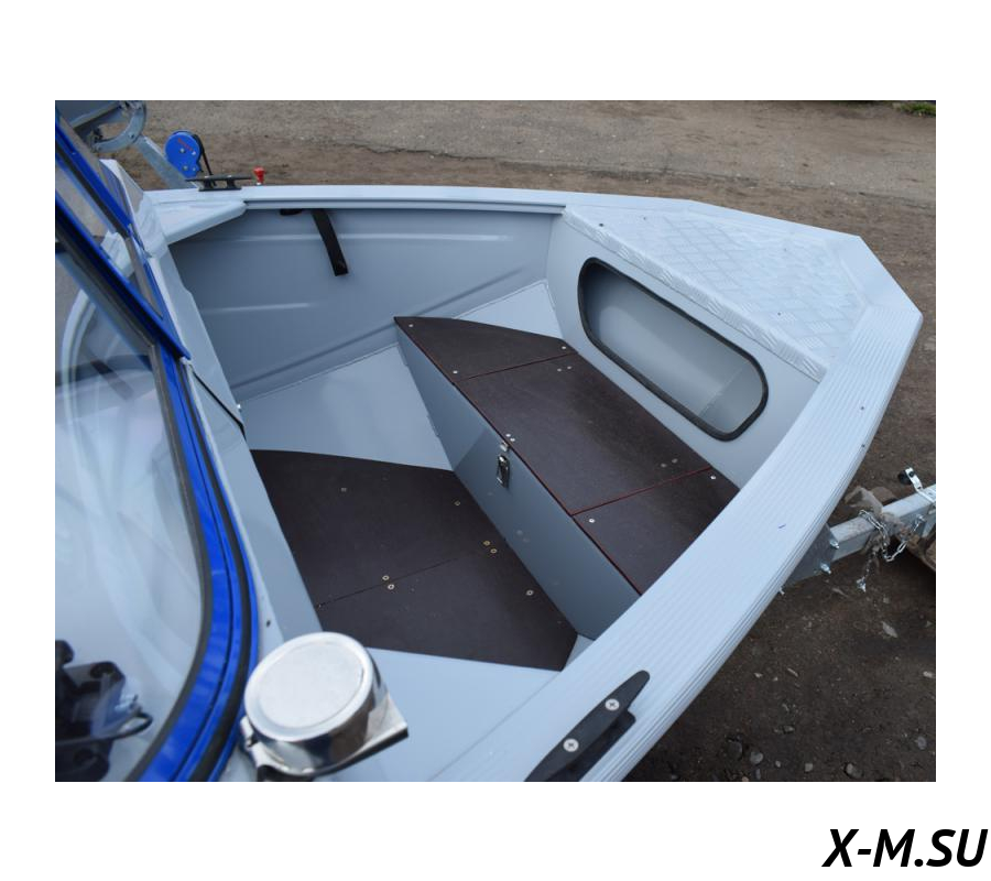 Компоновка переднего кокпита предлагается в двух вариантах: «Фиш» и традиционный. Первый высоко оценивают любители рыбалки на спиннинг – здесь приподнятая палуба с рундуками под ней, которая по выбору заказчика изготавливается либо из водостойкой фанеры, либо из нескользящего рифленого алюминия Квинтет. По заказу на палубу устанавливается вращающееся рыболовное кресло. Традиционный – это типичное для катеров Wyatboat сидение-рундук в носу, оснащенное крышкой с пружинными упорами, фиксирующейся в открытом положении. В обоих вариантах под носовой площадкой расположена якорная ниша, а к бортам и консолям приварены укосины – они повышают жесткость корпуса и туда можно врезать подстаканники или держатели для спиннинга.