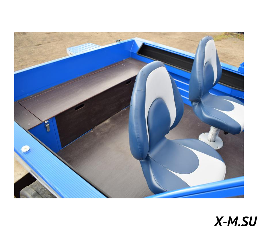Отличительная особенность 450 DC New – это широкий усиленный планширь с профилем Wyatboat, опоясывающий лодку от носа до больших кринолинов. По компоновке и оборудованию кокпита новая модель аналогична катеру Неман 450 DC: тут такие же алюминиевые консоли с бардачком на пассажирской и панелью электрических переключателей на водительской. Здесь тоже вращающиеся мягкие кресла Fish Pro со складной спинкой, обшитые карпентом полки-ниши в бортах, куда легко помещаются весла, и кормовой диван-рундук с подпружиненной крышкой и съемной передней стенкой для возможности перевозки длинномеров. По заказу рундук комплектуется мягкими подушками, а весь кокпит ходовым тентом, под которым можно стоять в полный рост.