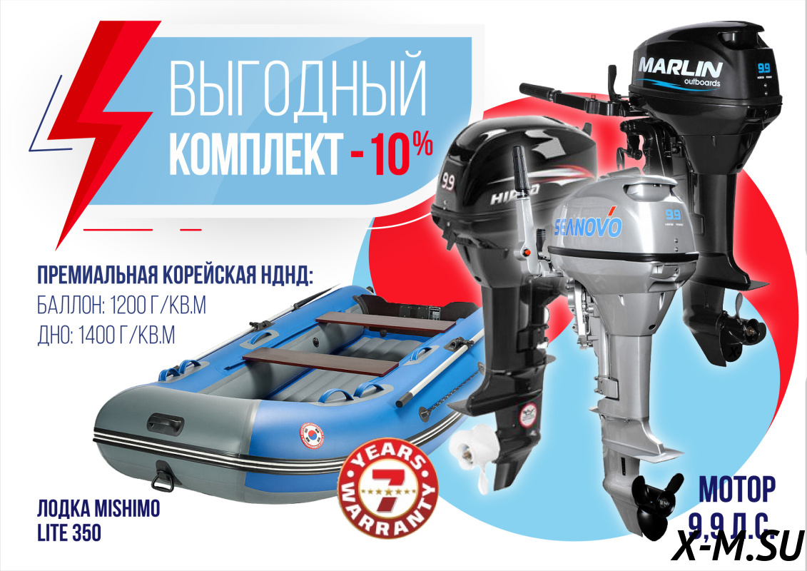 Брал этот комплект с мотором MARLIN MP 9.9 AMHS — просто огонь! Лодка MISHIMO LITE 350 легкая, но при этом оч прочная, не прогибается даже при полной загрузке. Мотор тащит как танк, без провалов. Единственное, пришлось немного повозиться с регулировкой руля, но это мелочи. За такую цену — топ вариант. Кстати, ссылка на мотор битая, но вбил в поиск и нашел. Всем рыбакам и любителям покатух — берите не пожалеете!