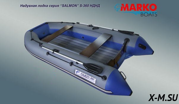 Надувная лодка "SALMON" S–370 оснащена стационарным транцем толщиной 27 мм, имеющим высоту 410 мм (стандарт), на который можно установить мотор мощностью до 20 л.с.. На транце прикручены защитные пластиковая и фанерная накладки под мотор. Кроме того, сверху транец защищен специальным ПВХ профилем, что обеспечивает его сохранность долгие годы. Транец вклеен в корпус лодки при помощи специальных держателей из ПВХ - трансхолдеров. Корпус лодки разделен на три отсека. Боковая поверхность баллона защищена боковым ПВХ профилем с брызгоотбойником. Есть сливной клапан. Лавки (банки) выполнены из ламинированной влагостойкой фанеры толщиной 18 мм, размер лавок 1000х250 мм., крепятся к бортам лодки с помощью системы "ликтрос-ликпаз", позволяющей выбрать наиболее удобное положение и, при необходимости, быстро поменять положение лавок. На носу лодки и на конусах баллонов для удобства переноски собранной лодки вдвоем установлены ручки ПВХ. В базовой комплектации уже установлена защита днища по килевой части и защита баллонов в кормовой части. Для перевозки используется удобная транспортировочная сумка. Транспортировочные сумки шьются из ткани Oxford 600D с ПВХ пропиткой.